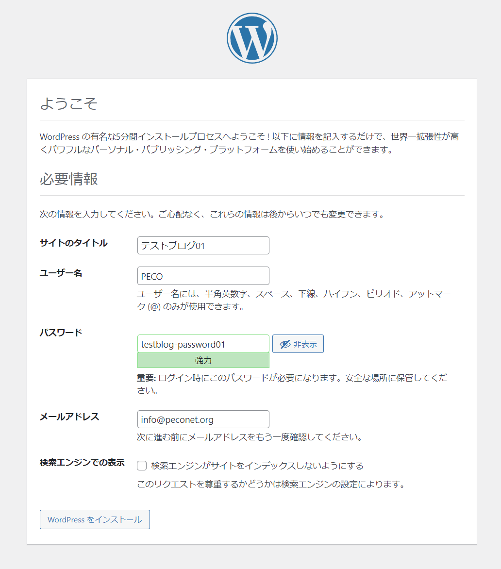 サイト名などを入力してゆきます。ここでのユーザー名とパスワードはWordPressの管理画面にログインするのに必要なので、忘れないようにします。