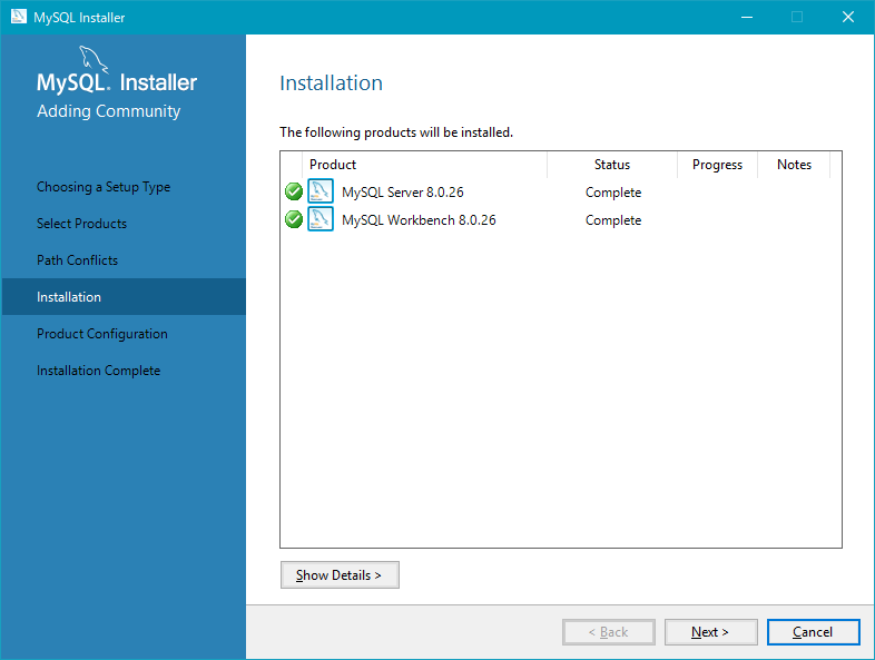 手動で左の窓からデータベース本体である「MySQL Server 8.0.26 - x64」とデータベースを操作、管理するGUIツール「MySQL Workbench 8.0.26 - x64」を選択して「→」をクリック。右の窓へ追加したら「Next」をクリックします。