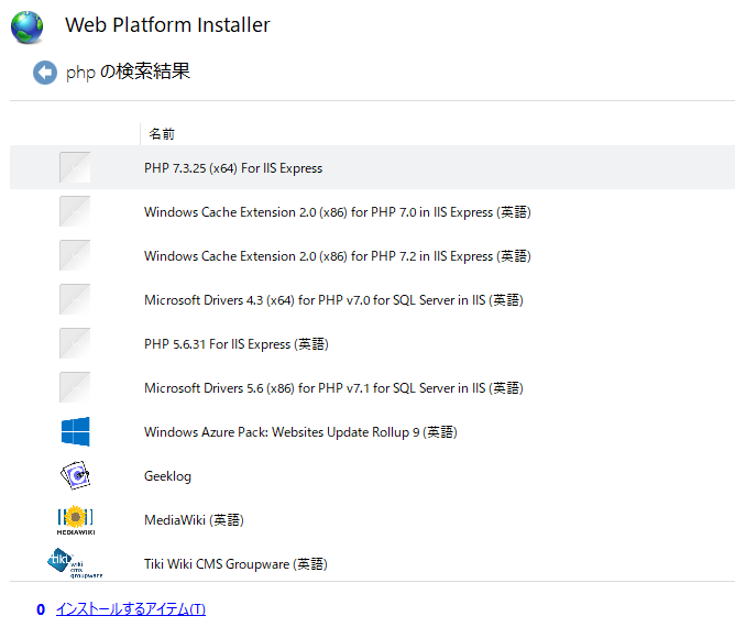 ※ 「PHP 7.3.25(x64)」という項目もありますが、高速な「PHP 7.3.25(x64)For IIS Express」をインストールします。