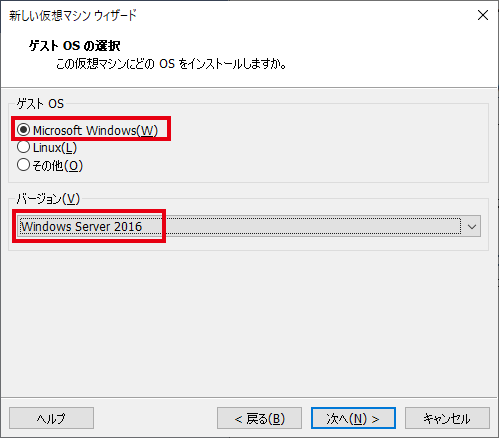 ゲストOSの選択。「Microsoft Windows」をチェックし、バージョンはWindows Server 2019はないので「Windows Server 2016」を選択して「次へ」をクリックします。