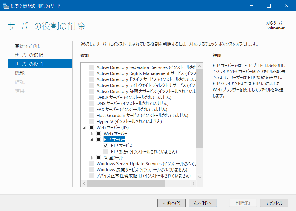 ※ FTPの設置にはIISインストール時にFTPサーバーもインストールされていることが必要ですので(FTPサーバーの項目にチェックを入れている)インストールしていない場合は役割と機能の追加から追加インストールして下さい。