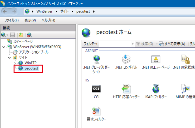 物理パスはルートディレクトリの作成で作成したフォルダ「C:\inetpub\wwwroot\pecotest」を指定します。
