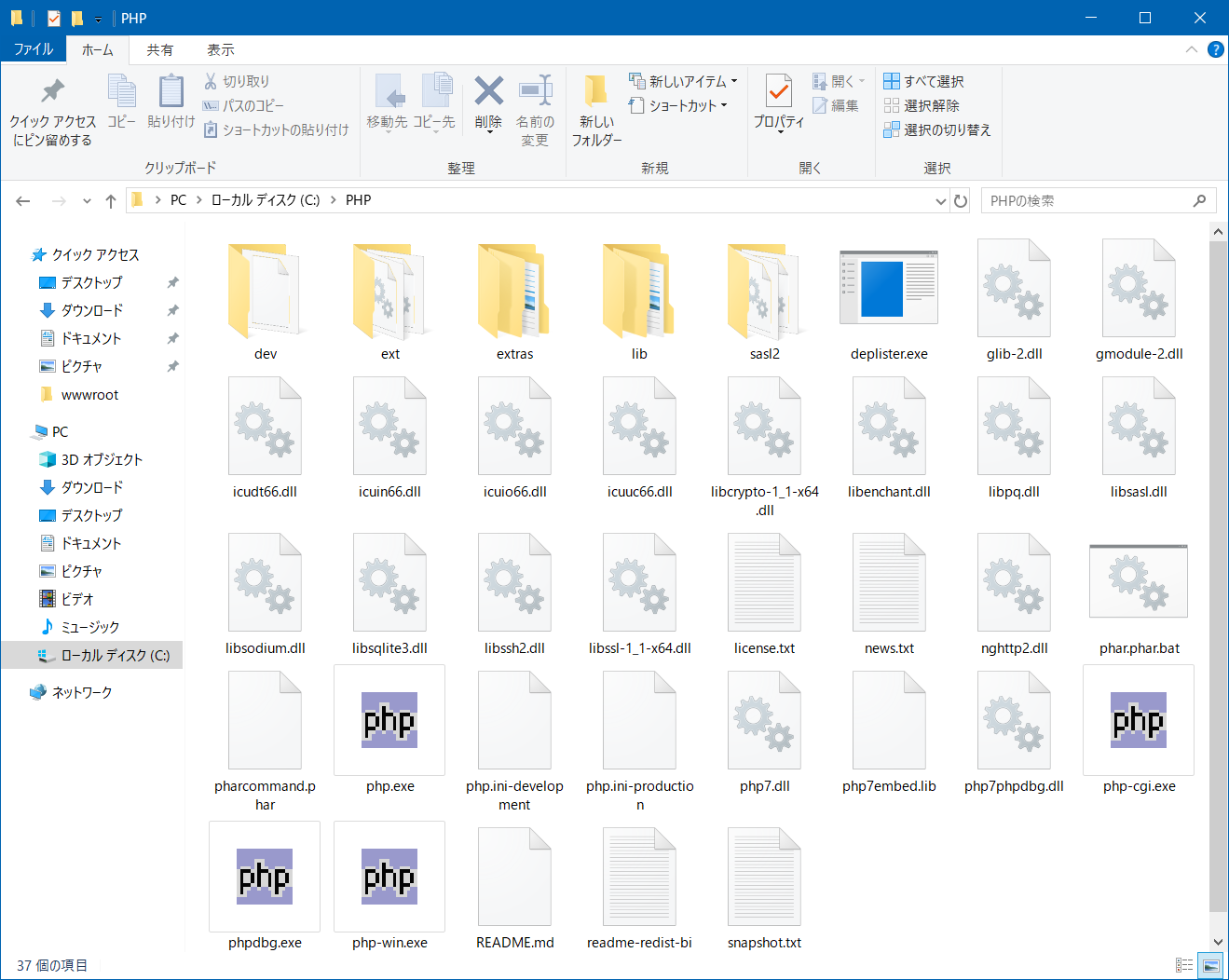このZIPファイルを展開して中身のファイルをCドライブ直下にPHPフォルダ「C:\PHP」を作成して配置します。